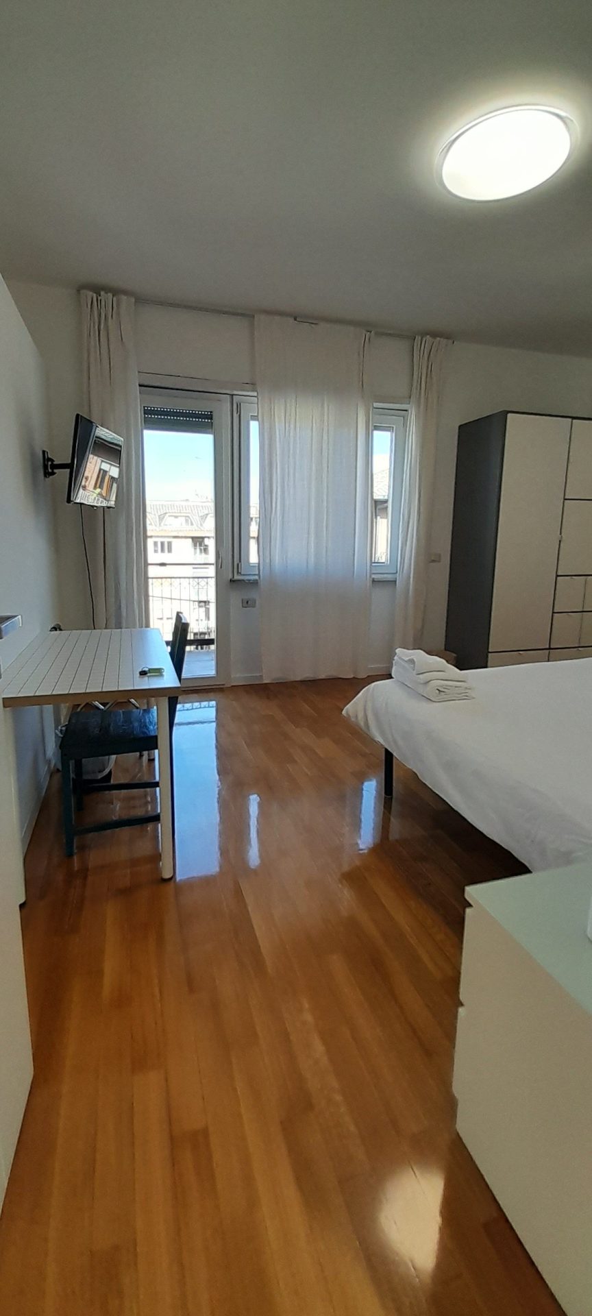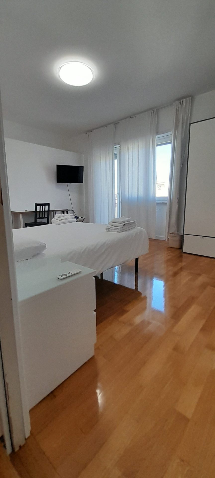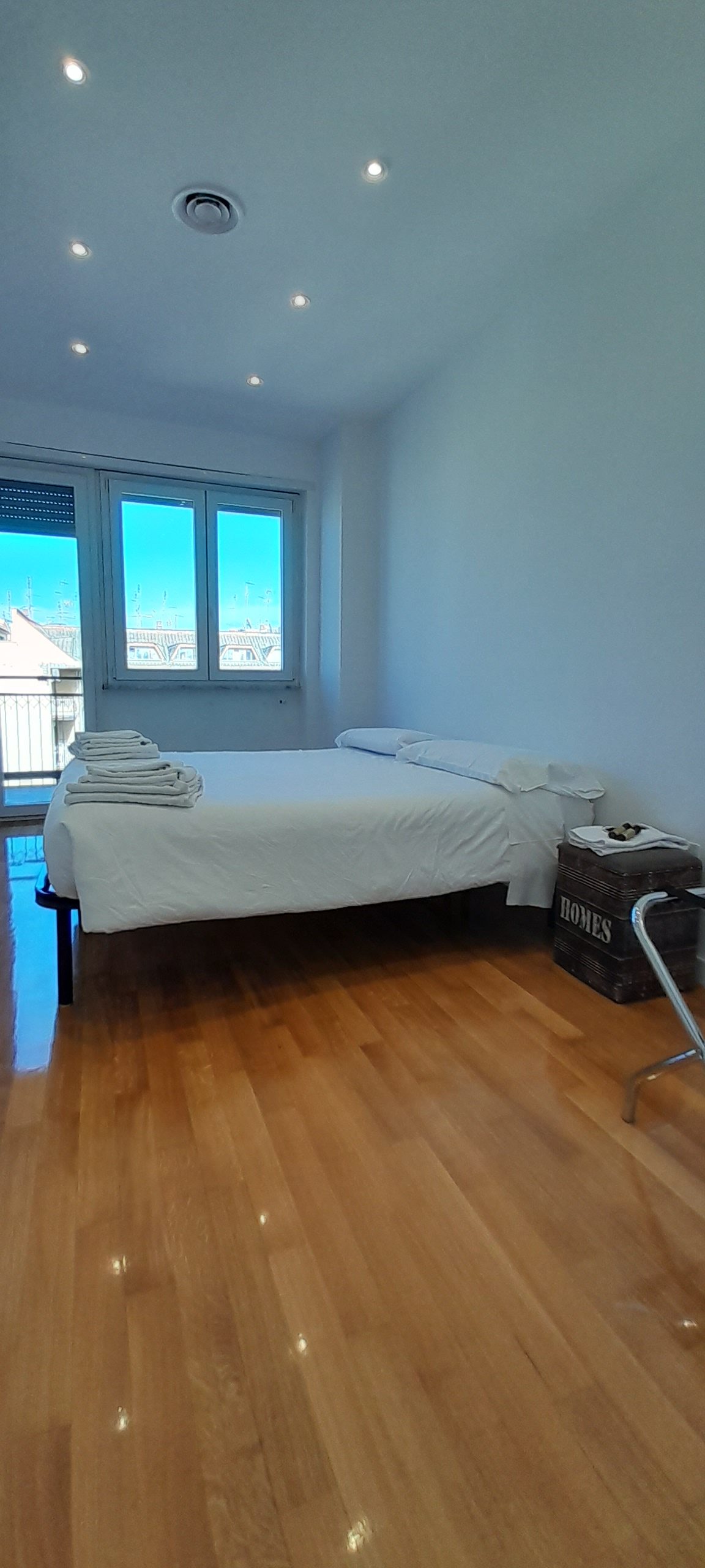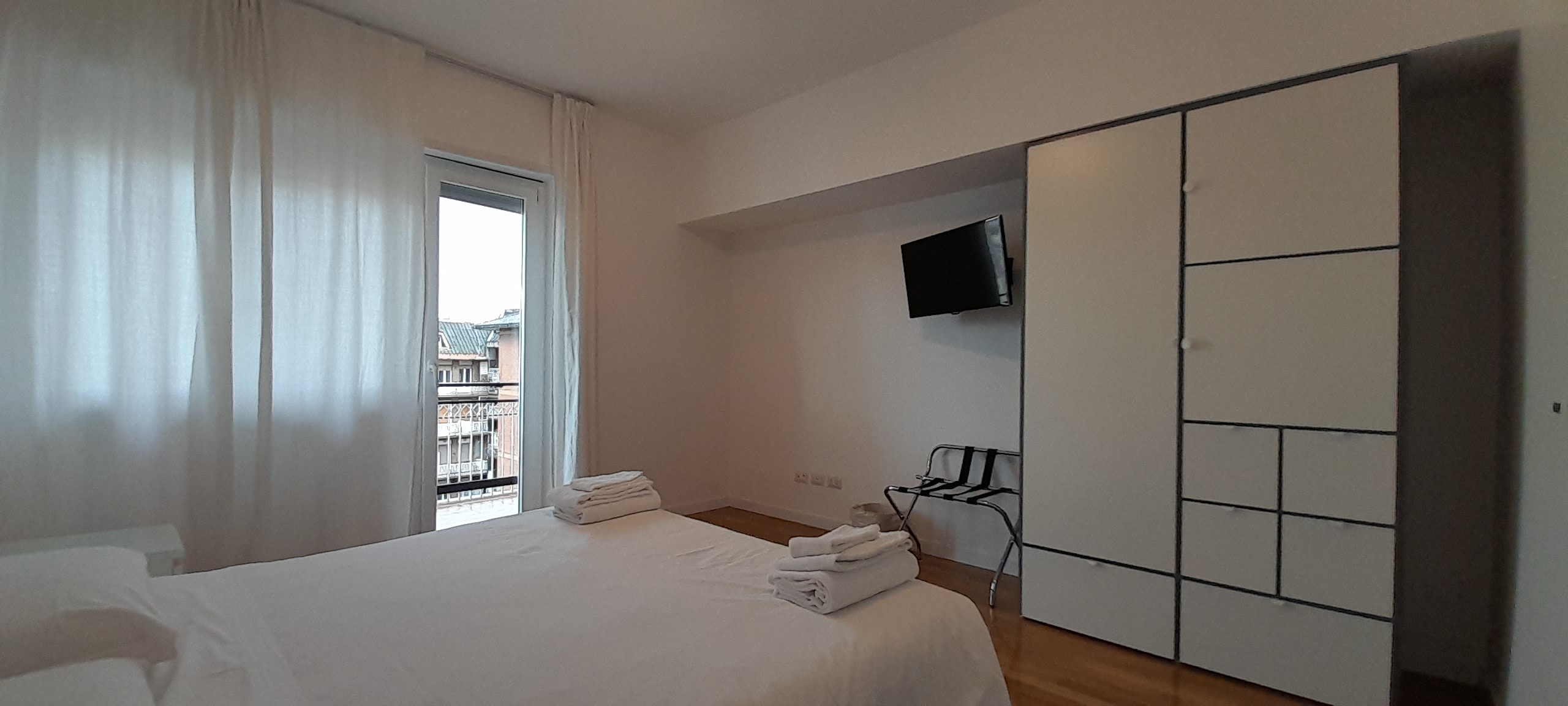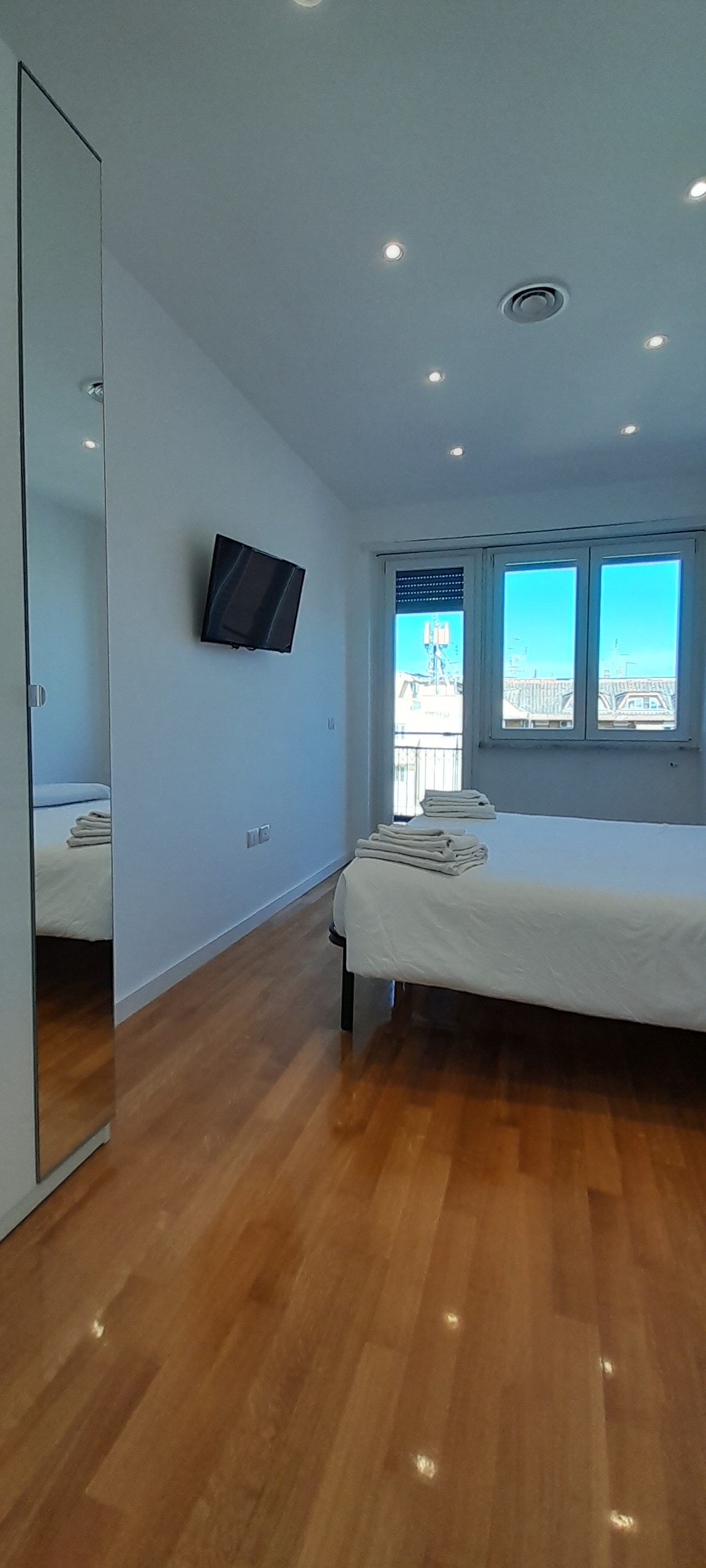 Double/twin room with air conditioning, wardrobe, penthouse balcony with city views and shared bathroom with shower.