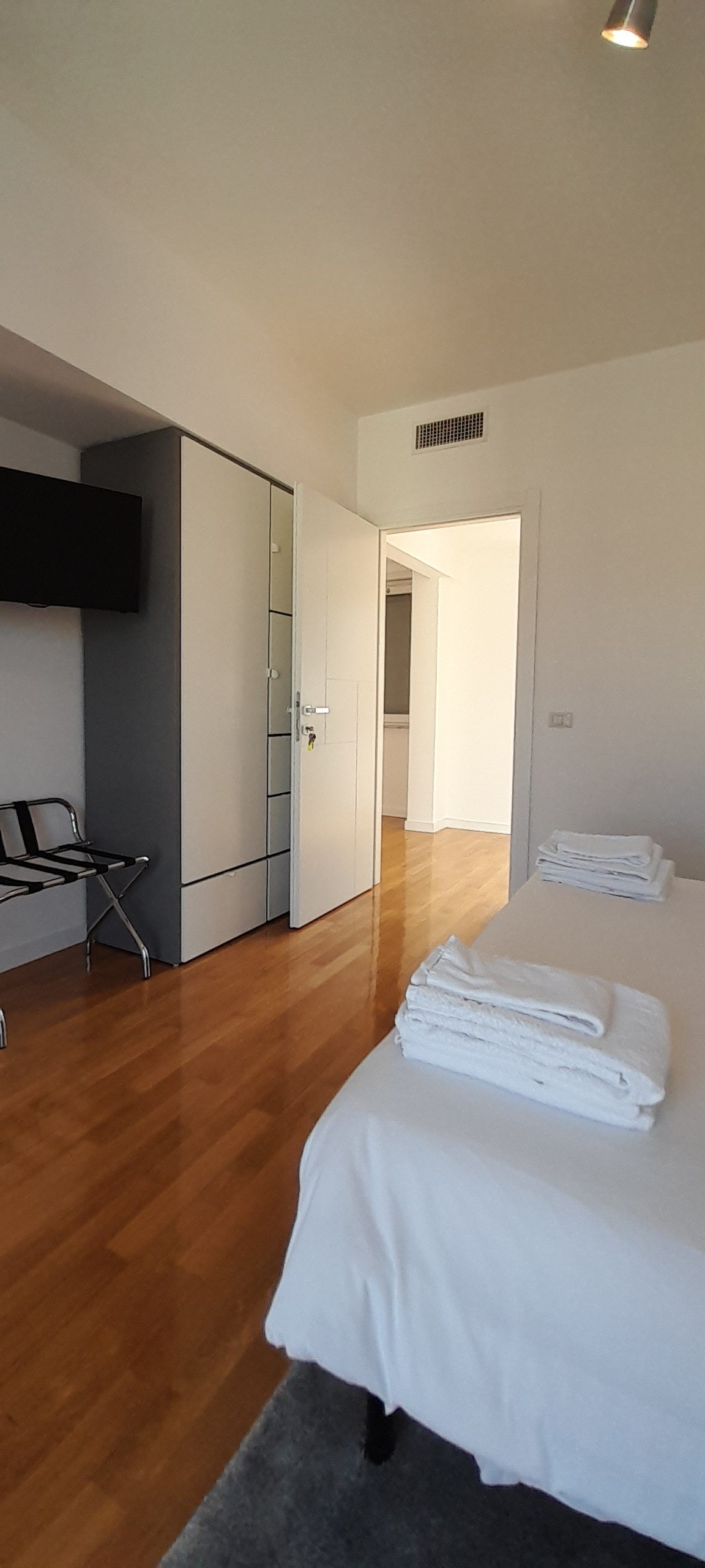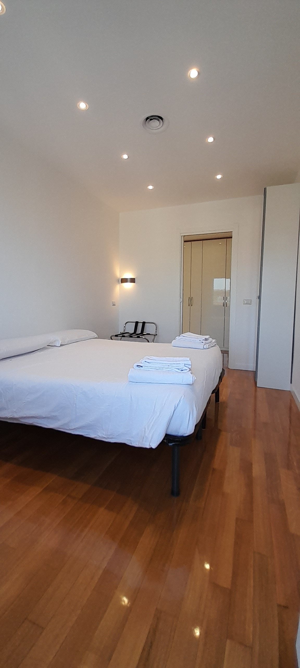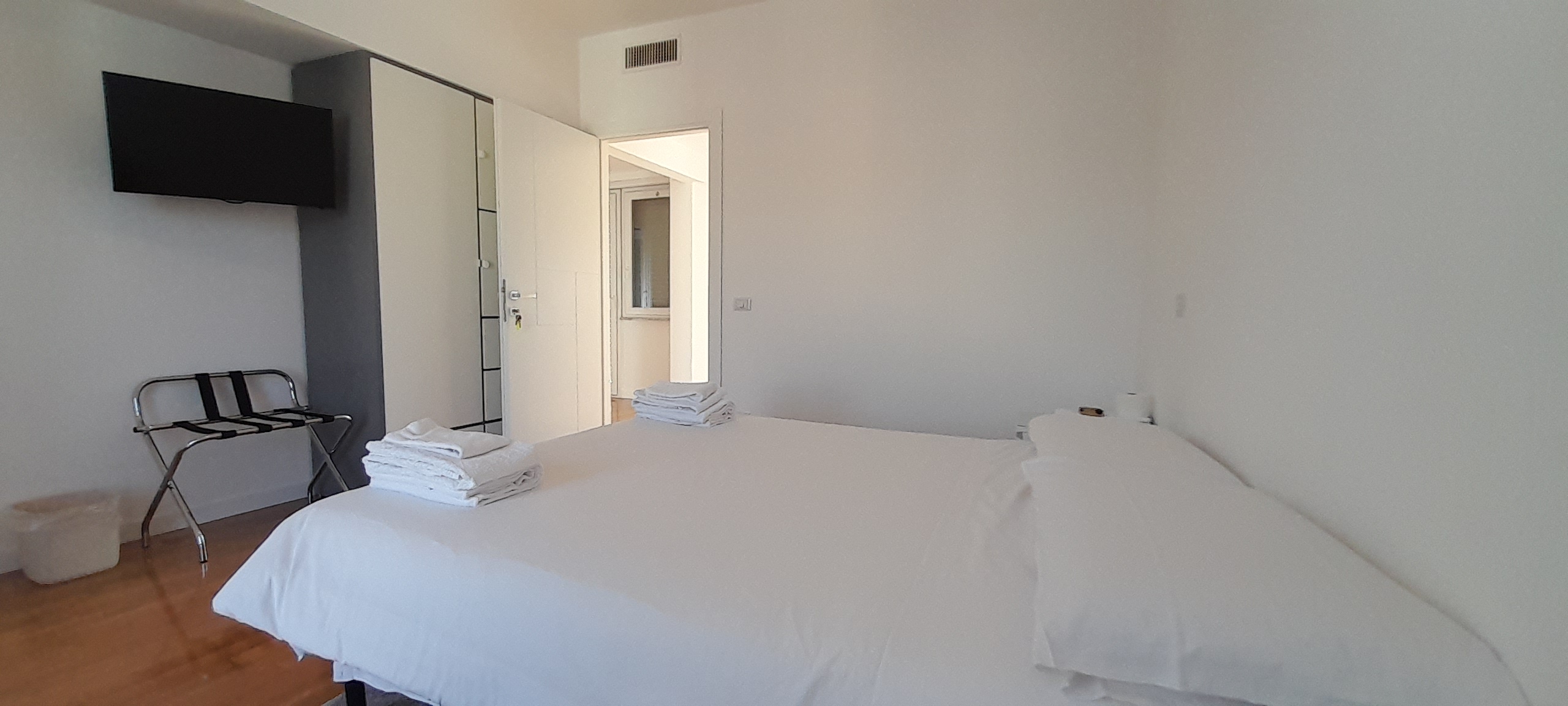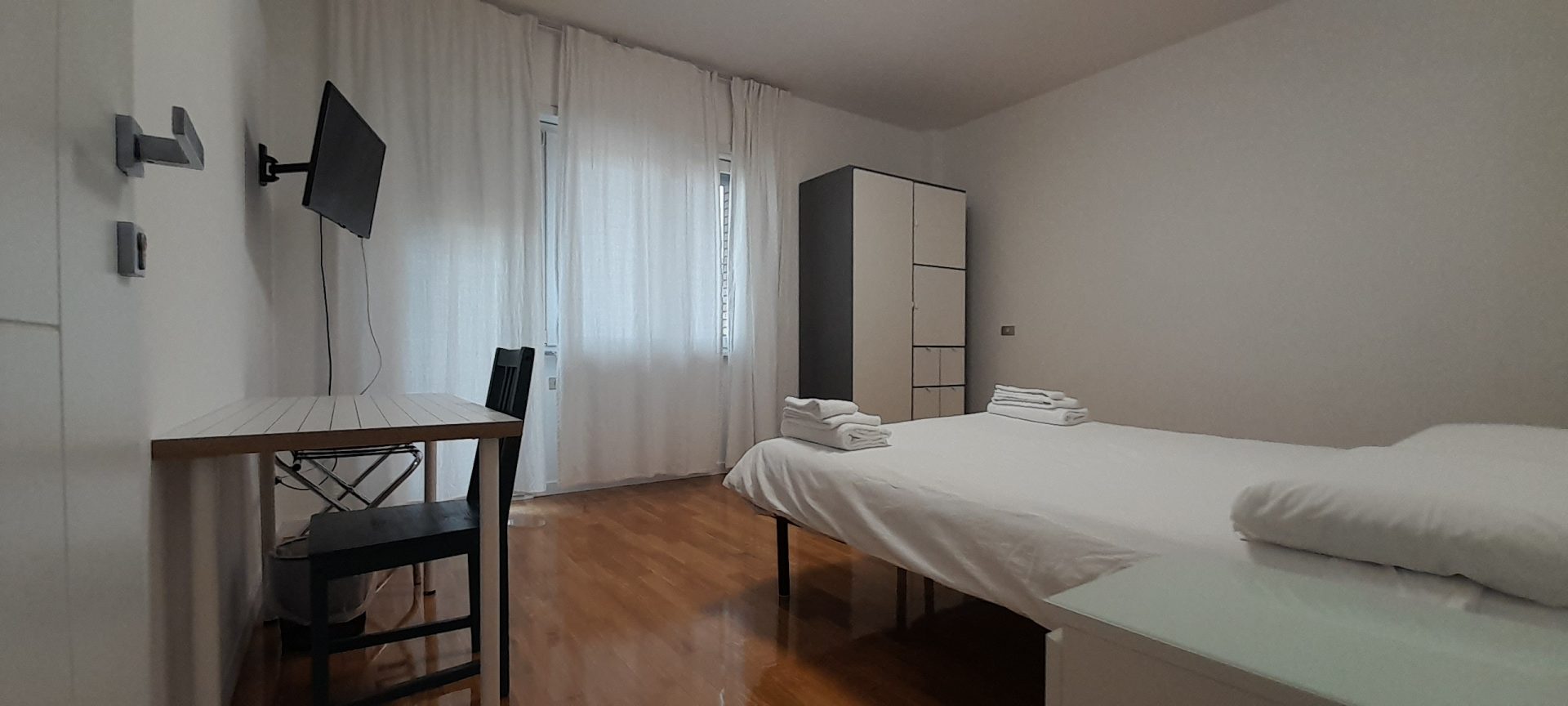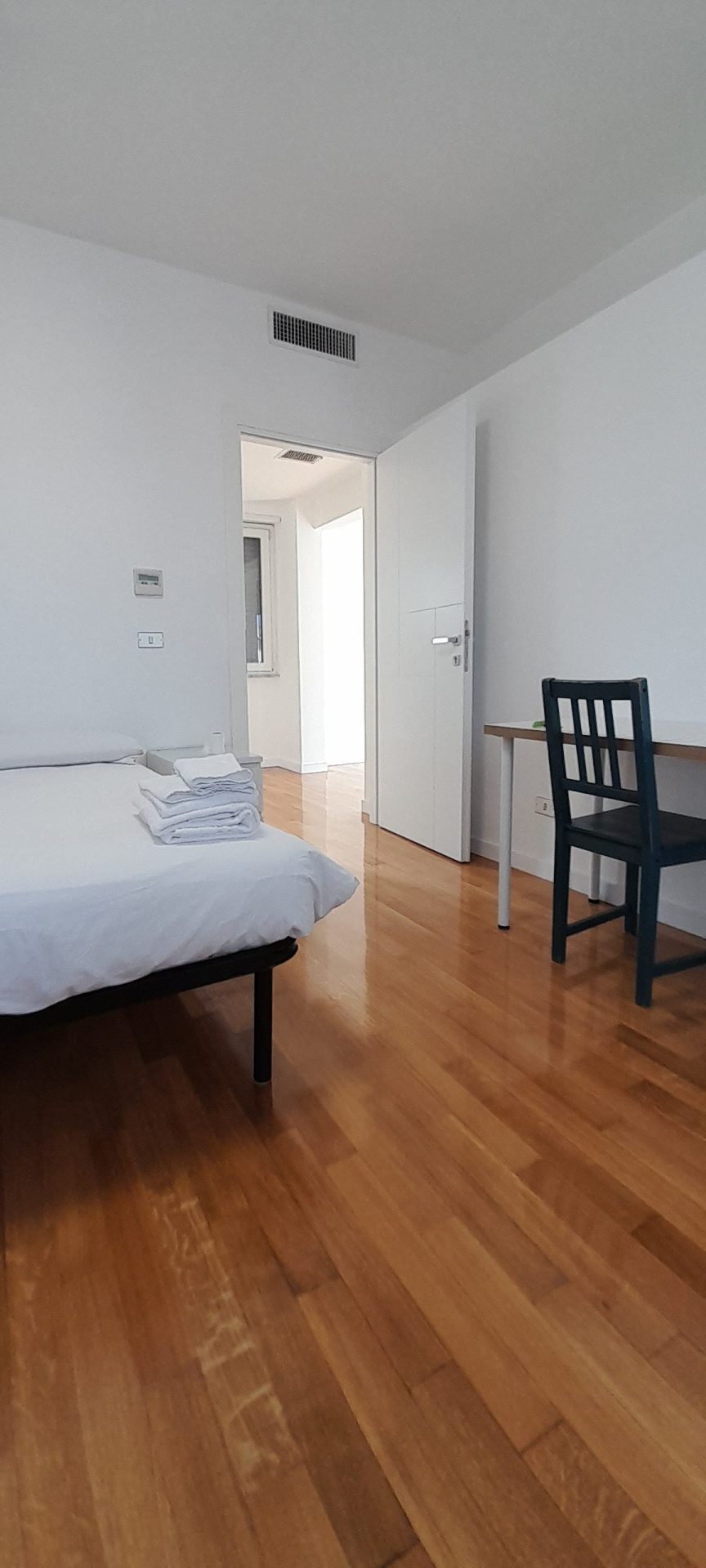 Double/twin room with air conditioning, wardrobe, penthouse balcony with city views and shared bathroom with shower.